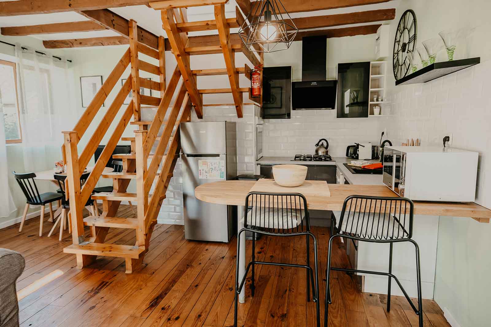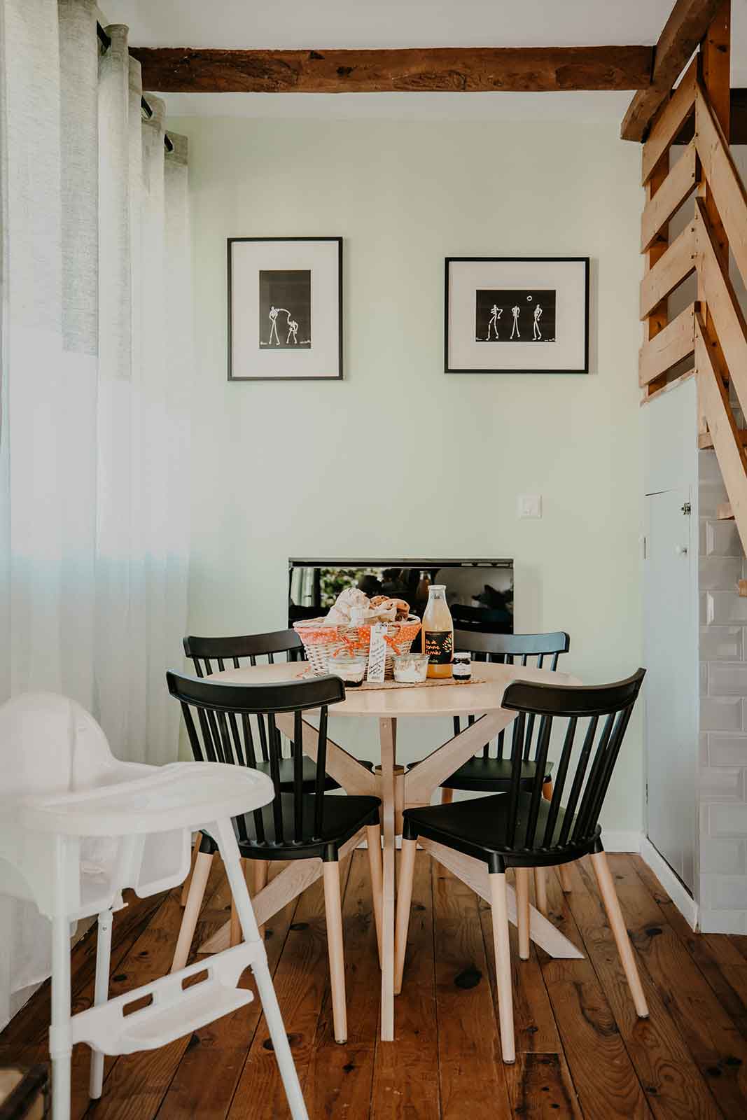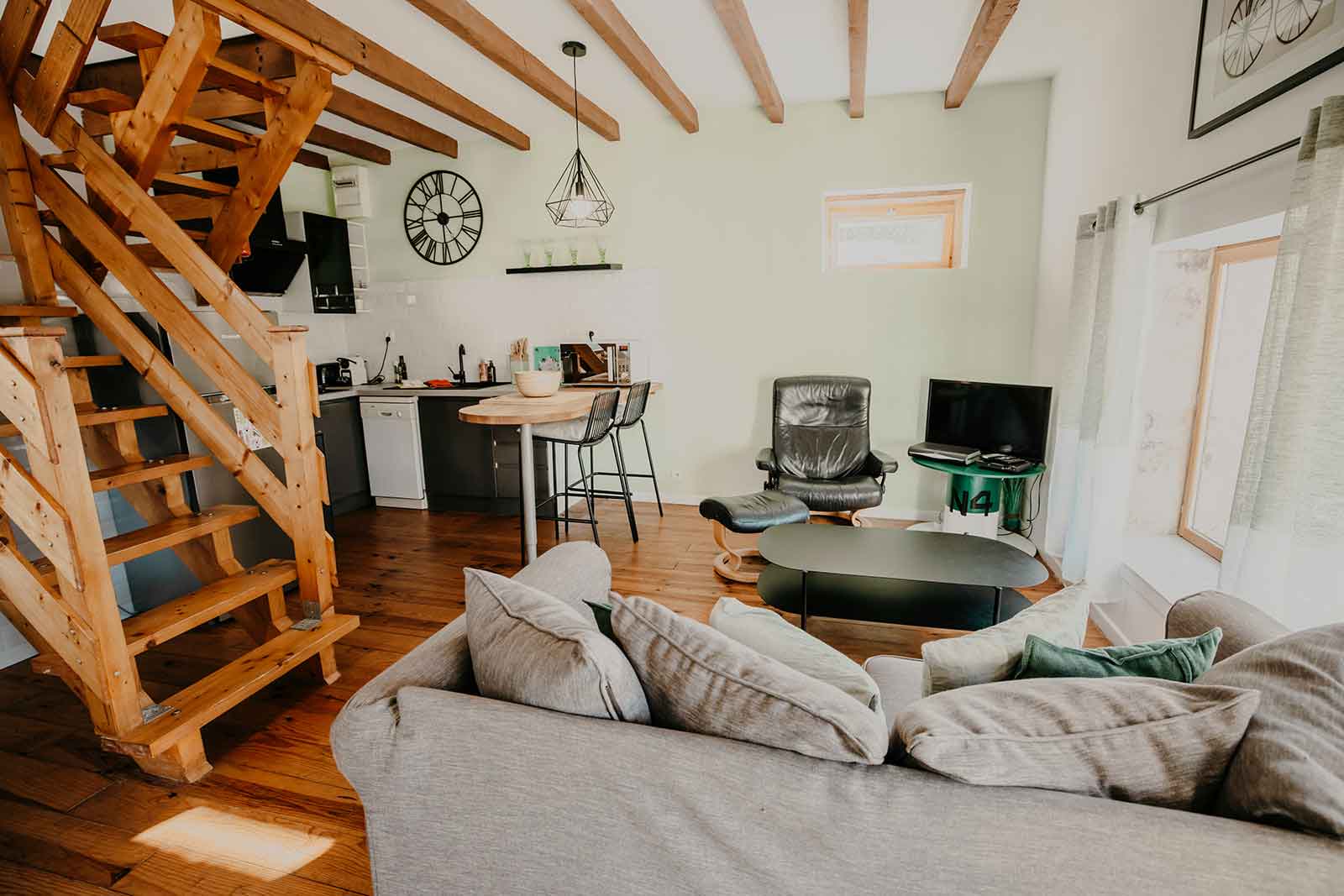 Number Four, set at the end of La Vieille Grange, is a bright and airy two-bedroom gîte with a fun, contemporary style. Its dual-aspect lounge fills the ground floor with natural light, flowing into an open-plan kitchen and dining area that’s perfect for easy holiday living.