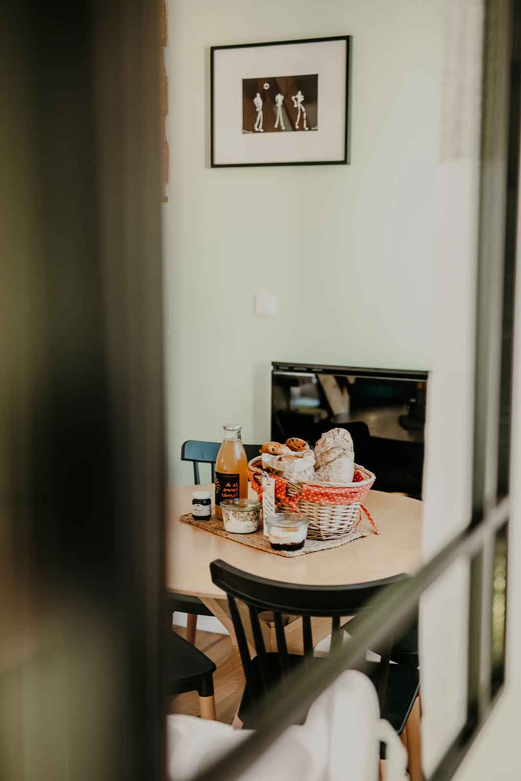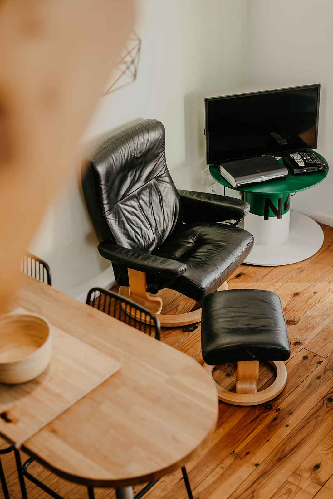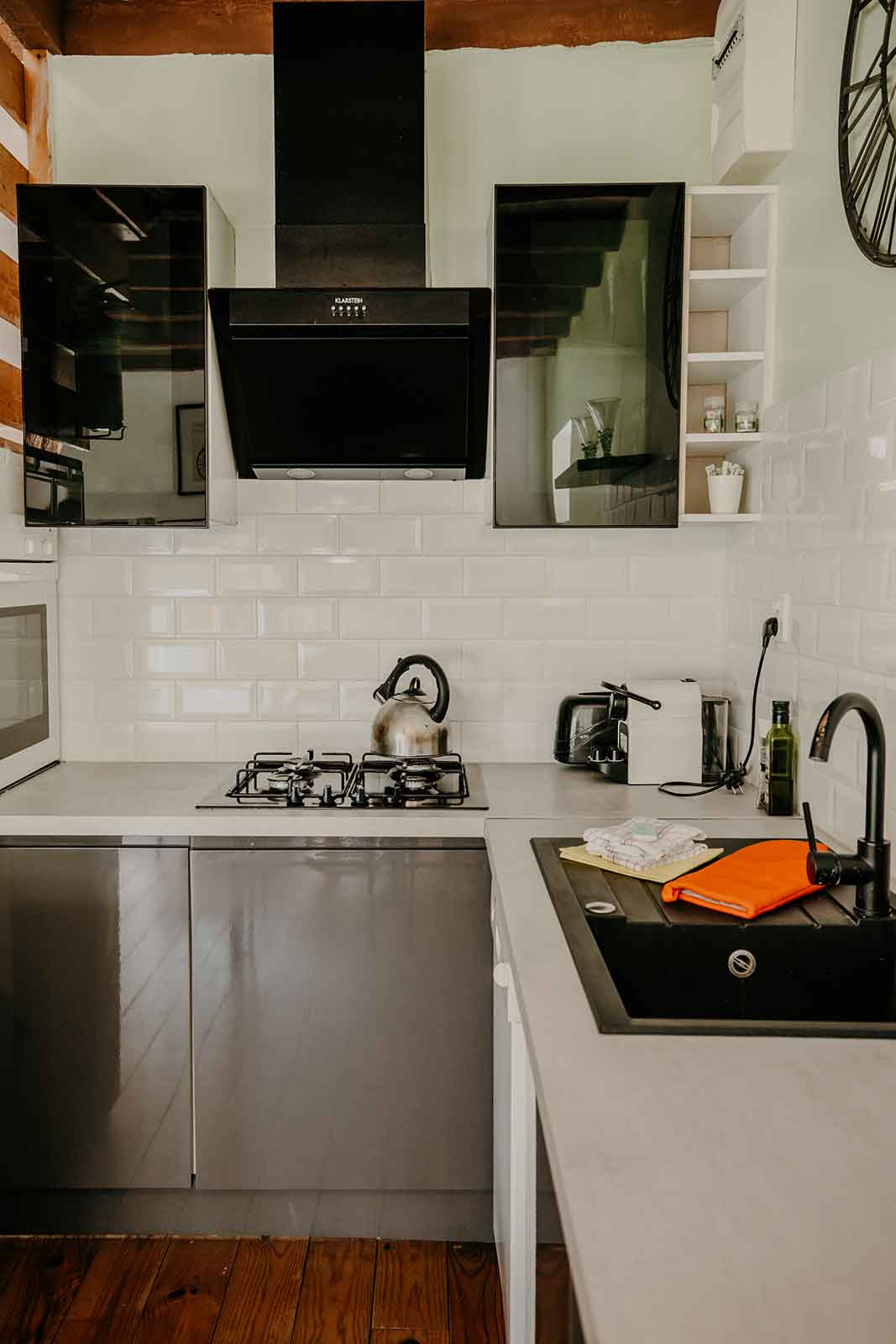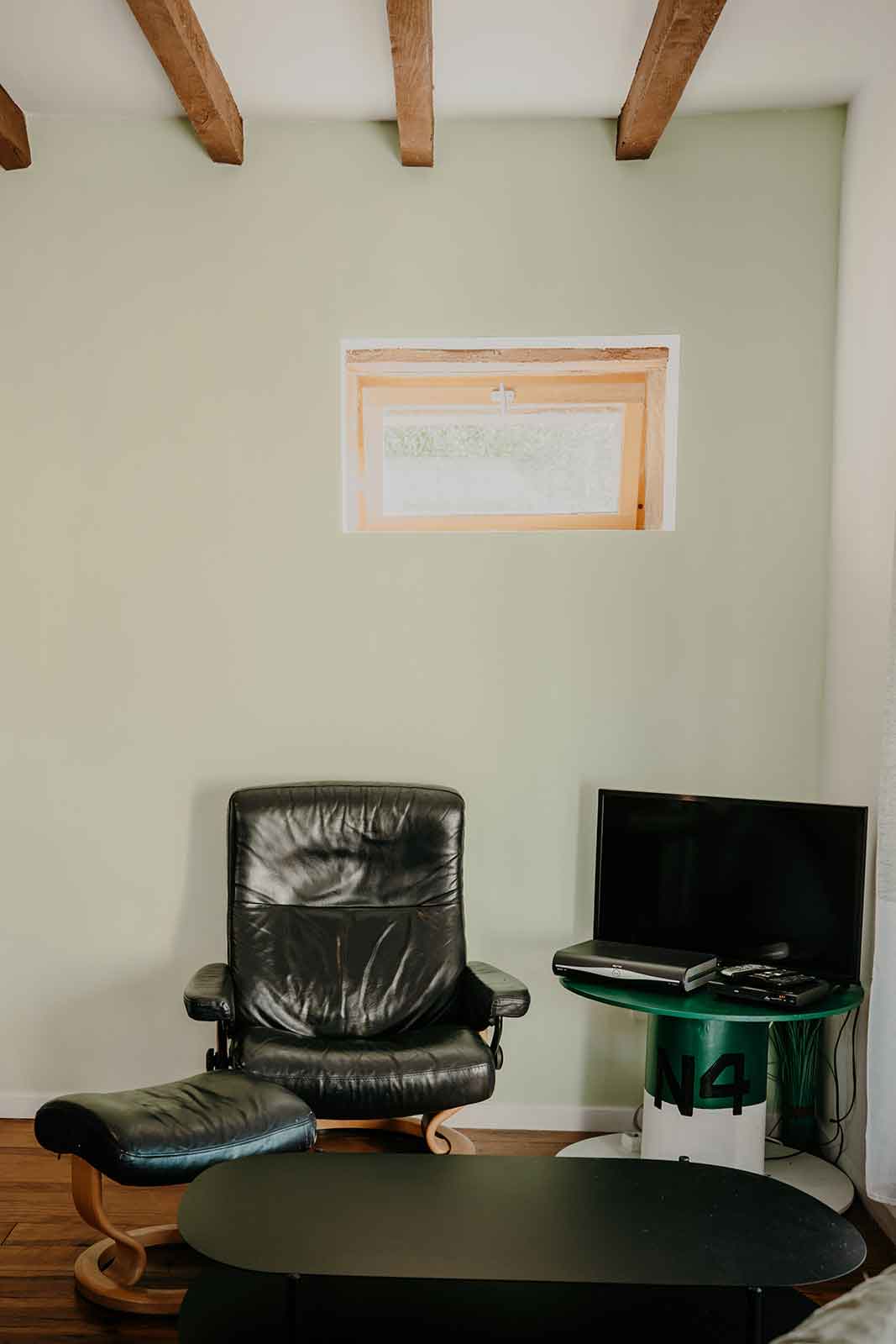Number Four, set at the end of La Vieille Grange, is a bright and airy two-bedroom gîte with a fun, contemporary style. Its dual-aspect lounge fills the ground floor with natural light, flowing into an open-plan kitchen and dining area that’s perfect for easy holiday living.