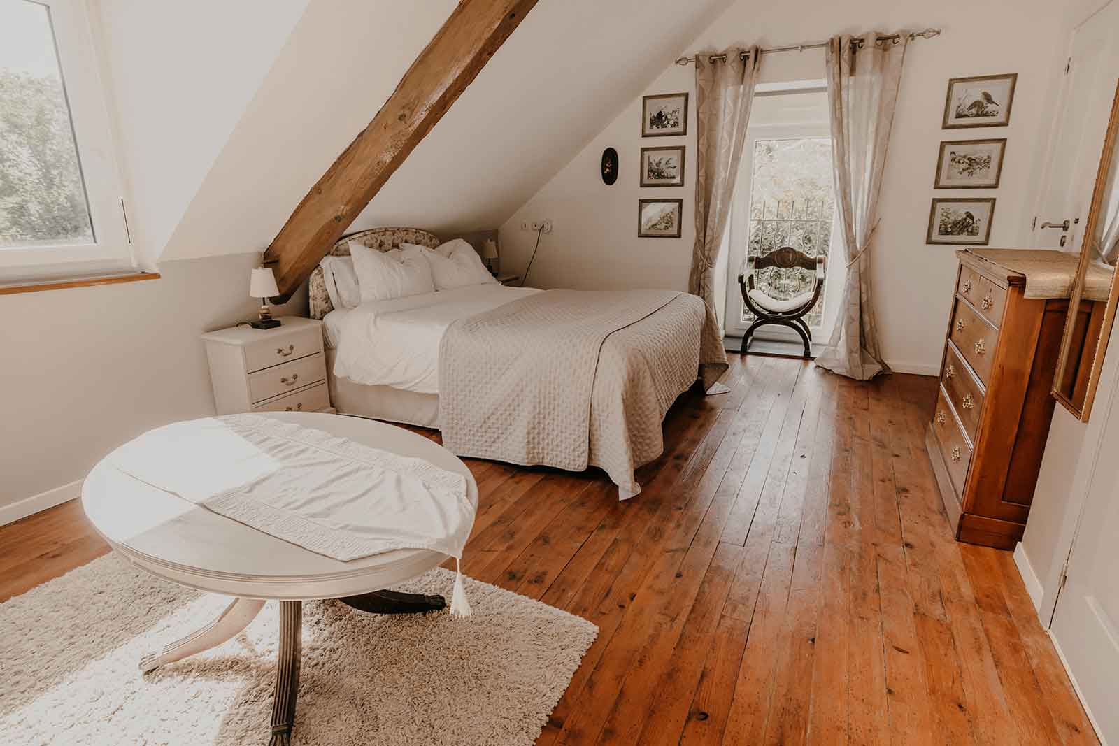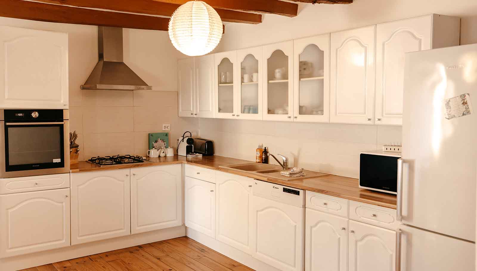 Number Two sits at the heart of the converted barn, a spacious gîte overlooking the courtyard. The well-equipped kitchen includes an oven, gas hob, extractor fan, fridge-freezer, dishwasher, Nespresso machine and all the utensils you’ll need for easy holiday cooking.