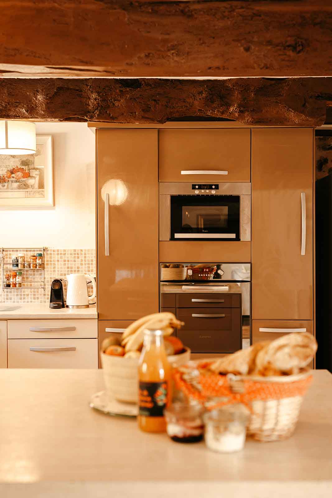 Le Pressoir, an old cider press, has a large open plan kitchen and living/dining room. Two sets of French windows, one opening onto the central playarea, the other a large private lawn. There is also a downstairs toilet.